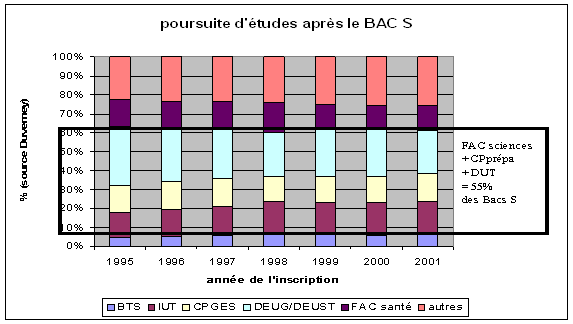 Ce constat est en fait à tempérer, ces évolutions pouvant s'interpréter comme l'effet d'une préférence aux études jugées plus professionnalisantes. Ainsi, DUT, BTS et classes préparatoires scientifiques ne subissent pas le même effet et au total, c'est un ratio quasiment stable (de 1995 à 2001) de six bacheliers scientifiques sur dix qui poursuit des études scientifiques ou technologiques.