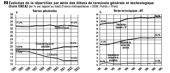 Quant à la baisse des baccalauréats scientifiques, elle doit être également pondérée : certes, le nombre de Bac S est passé de 139 à 129 milles sur a période 1995-2002(soit - 6,5%) ; mais il faut avoir en tête que sur la même période 1995-2002, les bac littéraires sont passés de 71 milles à 50 milles (soit -30%) et les Bac pro de 67 à 93,5 milles (soit +40%), les Bacc sciences éco et techno ayant eux peu variés (Bac ES en légère croissance de 76,5 à 79 milles et Bac techno à l'équilibre ayant passé de 138 à 141 milles avec un max en 152 milles en 2000) [sources : DEP MEJENR, rapports Ourisson et Duverney].