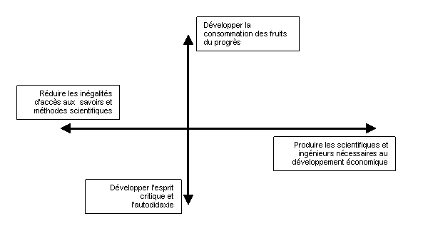 D'une part, une première ambiguïté porte sur la nature des acquisitions souhaitées : certains prétendent permettre l'appropriation de méthodes d'investigation et le développement de l'esprit critique, comme les centres de vacances scientifiques du réseau « Planète sciences » , tandis que d'autres agissent pour favoriser la plus large consommation des fruits du progrès technique, comme la galerie des innovations de la Cité des sciences et de l’industrie, avec des expositions du type « tout capter » en partenariat avec l’opérateur téléphonique Orange. Pour être bien clair dans la description du spectre d’objectifs, il faut préciser qu’à ce stade, se trouvent agrégés du coté de « développer l’esprit critique » à la fois les acteurs qui revendiquent cet objectif pour le plus grand nombre (la généralisation de la « main à la pâte » dans toutes les écoles primaires) et ceux qui cherchent à développer des « ateliers délibératifs » ayant pour objectif l’instauration de débats publics [21] et qui ont besoin de mettre en place des jurys populaires pour juger de la pertinence de telle ou telle décision technoscientifique. Objectif louable dans des sociétés comme les nôtres qui se revendiquent comme démocratie scientifique [22], mais qui revient –comme lors de la constitution de jurys populaires- à extraire quelques citoyens cobayes pour en faire des témoins de l’acceptabilité ou non de telle ou telle décision.