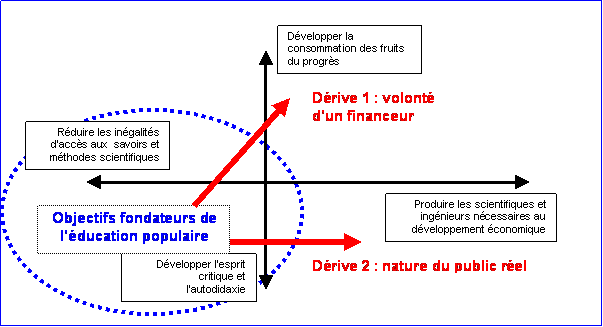 Plus fondamentalement, on ne peut éluder la question de savoir si ces ambiguïtés d’objectifs ne généreraient pas de multiples effets contradictoires rendant velléitaires les tentatives de mise en "culture populaire" des sciences. N'y aurait-il pas en réalité au moins deux courants culturels aux objectifs différents, paradoxaux voire antagonistes ? L'un, proche des valeurs de l'éducation populaire [26], et qui s'attacherait surtout à l'émancipation socioculturelle (l’ « empowerment », pour reprendre l’expression nord-américaine en passe de se généraliser dans le monde de la santé) du plus grand nombre via l'appropriation de méthodes de résolution de problèmes et d'autoformation, tandis que l'autre viserait principalement à améliorer la production du progrès technique par une élite de chercheurs et d'ingénieurs et sa consommation (oserait-on ajouter la plus compulsive possible) par les citoyens.