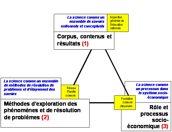[35] Renar blandin : « C'est sans doute au niveau des collèges et des lycées qu'un effort important reste aujourd'hui à réaliser. Certes, la référence aux contenus du savoir est plus importante dans l'enseignement secondaire et le recours à l'expérimentation est limité par l'effectif des classes et l'absence de personnel de laboratoire. La rénovation de l'enseignement des sciences dans les collèges et les lycées ne passe sans doute pas par une réforme des programmes, mais plutôt par la recherche d'une approche nouvelle qui permette davantage des regards croisés et une perspective interdisciplinaire. Comme l'ont montré de nombreux débats sur la science au lycée, l'enseignement actuel est sans doute trop marqué par une approche trop fragmentaire et segmentée par discipline, qui paraît aux adolescents coupés des grands problèmes de société qui les intéressent. En outre, une présentation trop dogmatique peut donner aux élèves le sentiment qu'on leur enseigne des connaissances intangibles, étrangères à tout défi et à toute découverte. »